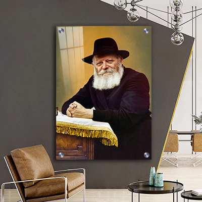 תמונה מיוחדת של הרבי מליובאוויטש נשען על הסטנדר ומביט ישר. המבט מלא שלווה, חכמה ואהבה רוחנית, והוא משדר עוצמה שקטה שממלאת את החלל בתחושת קדושה.