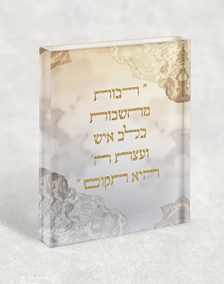 בלוק זכוכית אקרילי עם הפסוק "רַבּוֹת מַחֲשָׁבוֹת בְּלֶב אִישׁ"