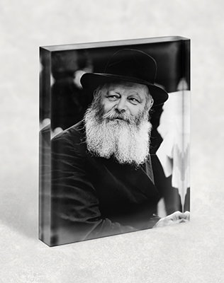 התמונה מתארת את הרבי מליובאוויטש ברגע מיוחד, כשהוא מביט הצידה במבט עמוק ומשמעותי. גווני השחור לבן מעניקים ליצירה מראה קלאסי שמדגיש את עוצמתו הרוחנית.