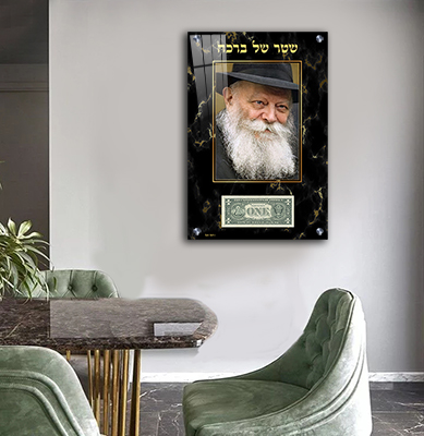 תמונת זכוכית של הרבי עם מקום לשטר הדולר – עיצוב יוקרתי בשיש שחור וזהב