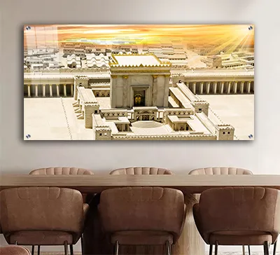 השילוב בין הצבעים החמים של השקיעה לבין אור הזהב העדין יוצר תחושת רוגע והתעלות. כל פרט בציור מדגיש את יופיו האלוקי של בית המקדש וממלא את הלב שלווה והתרגשות.