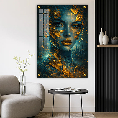 W-38 – תמונה מודרנית של בחורה ברקע טורקיז וזהב על קנבס או זכוכית