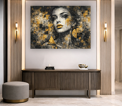W-53 – תמונה של בחורה ברקע אפור וזהב להדפסה על קנבס או זכוכית